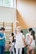 Und zwar am besten aus der Reihe. Das ließen sich 30 Kinder aus der dritten Klasse nicht zweimal sagen – und tanzten erst einmal wild darüber nach, welcher Ort denn nun ihr Lieblingsort sei. Vom Wolkenland über den Mirabellgarten bis hin zu Papa wurden vielerlei Antworten genannt, die anschließend in lyrische Gedichtform gebracht wurden. Gemeinsam mit der Choreografin Riikka Läser bildeten die Schüler:innen in Workshops dann eine Brücke zwischen Sprache und Bewegung und verwandelten ihre Gedichte schließlich in Tanz.