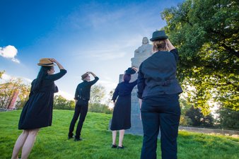 Ein Denkmal aus Stein verehren? Erschien uns erst mal gar nicht so wirklich prickelnd. Aber mit einer Prise Humor und gedanklicher Metaebene wurden aus Idee und Auftrag letztendlich eine richtig tolle und gewitzte Tanzperformance, die einem pompösen Tribut an Beethovens Werken in nichts nachsteht.